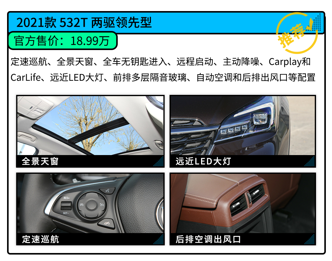 当然如果你觉得新款昂科威售价超过了你的购车预算,且不需要那么大的空间,也可以考虑现款在售昂科威。而对于现款昂科威配置选择上,买买君更推荐2021款 532T 两驱领先型,虽然是最入门版本,但配置一点都不低,像定速巡航、全景天窗、全车无钥匙进入、远程启动、主动降噪、Carplay和CarLife、远近LED大灯、前排多层隔音玻璃、自动空调和后排出风口均为标配,比其他车型的中配配置还要高。