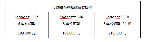 6座福特领裕建议零售价:EcoBoost®225 6座铂领型189,800元,EcoBoost®225 6座尊领型199,800元,EcoBoost®225 6座尊领型PLUS 219,800元,预计4月中下旬正式上市交付。