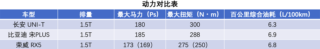 动力方面,三款车型均搭载1.5T发动机,匹配7速双离合变速箱,让动力传递更为直接。另外,荣威RX5车型还可选6速手动变速箱,一定程度上满足部分消费者对手动挡的需求。其中,长安UNI-T的动力数据较好,同时该车的最大扭矩转速从1250转开始,较另外两款车型更早,让长安UNI-T有更好的爆发力,前段加速更为迅猛,且能在一定程度上兼顾车辆的燃油经济性。