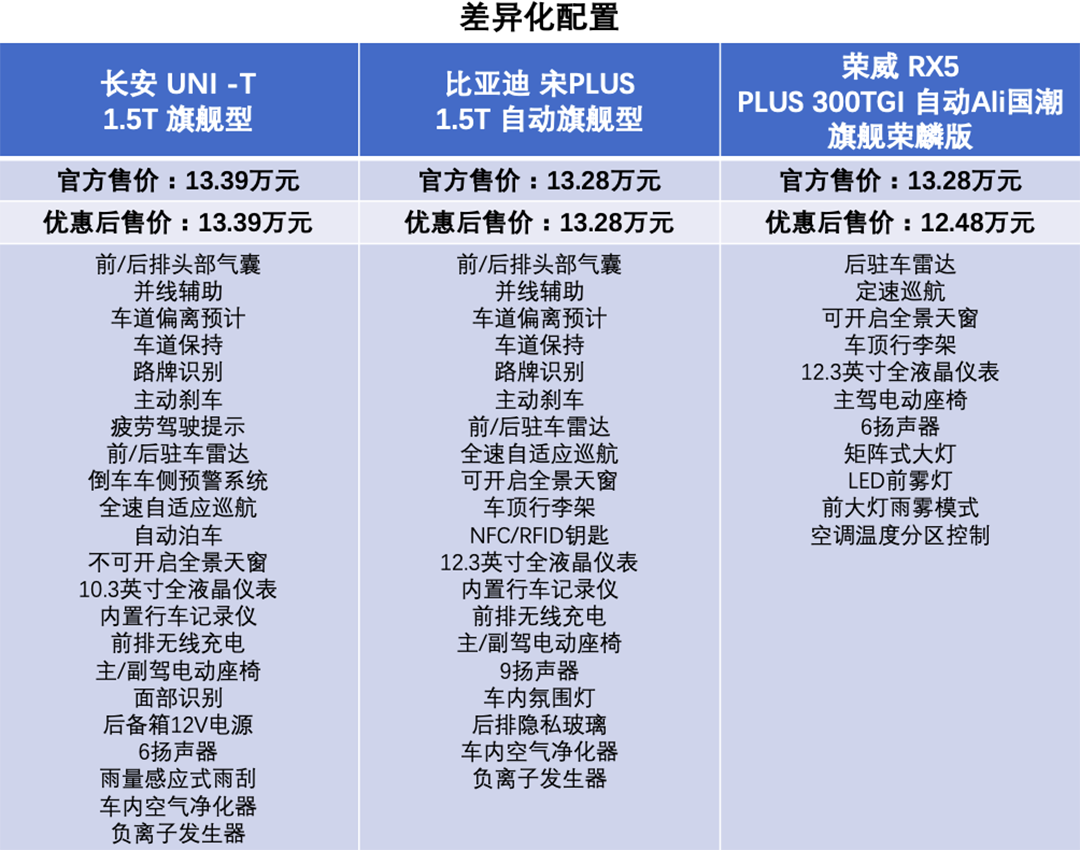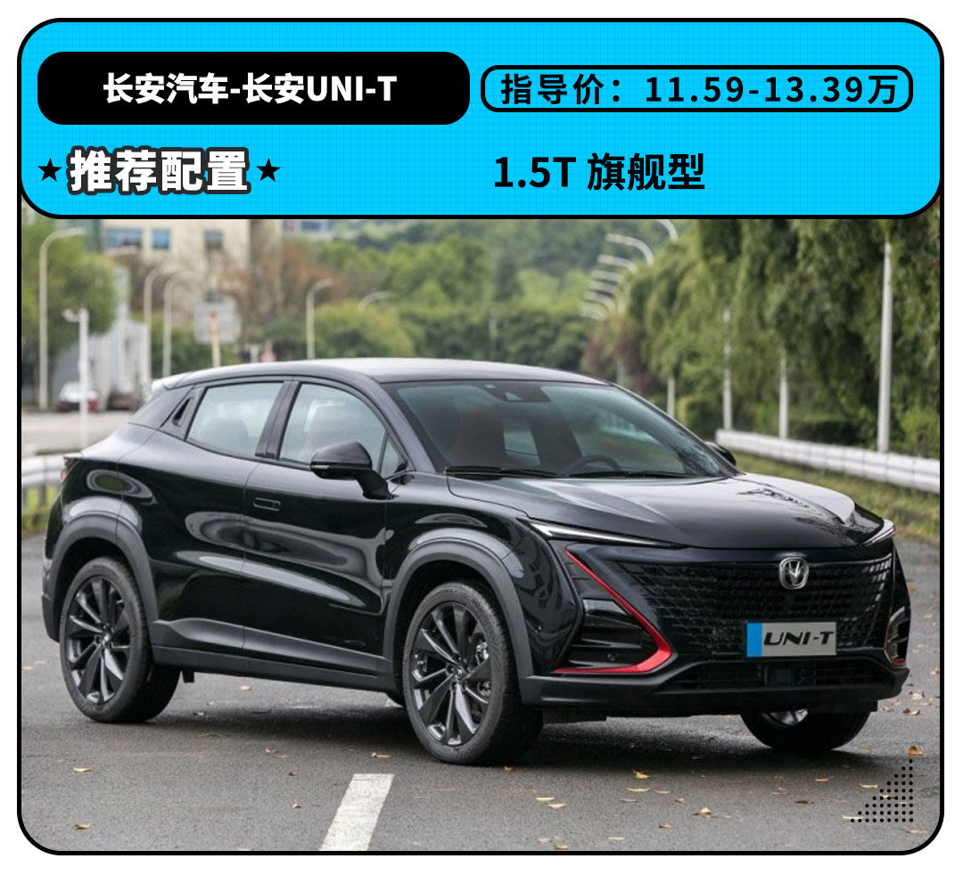 在配置对比这个环节中,买买君选择了官方售价较为接近的三个配置车型进行对比,其中长安UNI-T为顶配车型,另外两款为中高配车型。从上表可以看出,三款配置车型,配置最为丰富的是长安UNI-T车型,该配置车型基本是满配的存在。