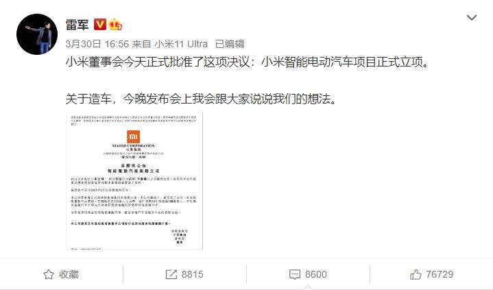 雷军微博透露的内容并没有太多,只是说了一下项目的大概,而很多的细节都在3月30号晚上的发布会上和大家聊,于是教授也去全程听了一下,记录并为大家圈出了重点内容。