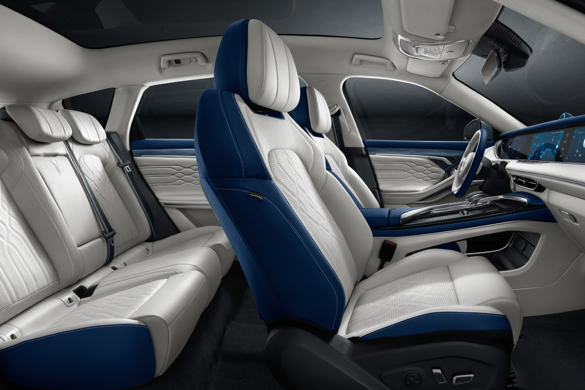 动力部分,新车提供纯电动和增程式混动两种动力版本可选择,纯电版搭载前后双电机0-100km/h加速成绩为4.8秒,最高车速为200km/h,NEDC续航里程为500公里。
