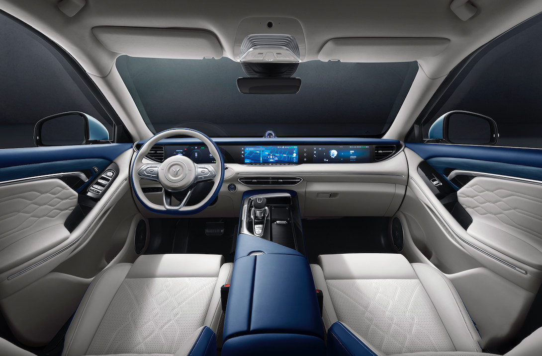 与过度追求科技感从而导致内部空虚的一些新能源车不同,岚图FREE内饰部分采用了蓝白双色内饰,突出其游艇风格设计,并且采用T型对称式布局,更显豪华感。
