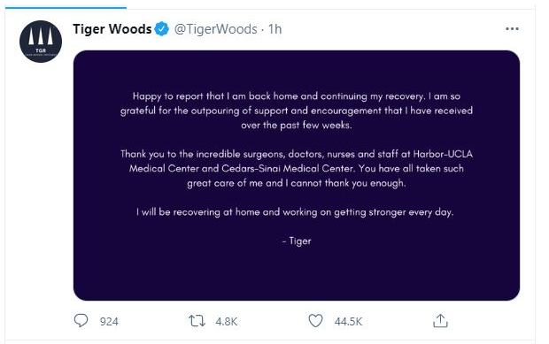不过万幸的是,这次严重的车祸并没有造车生命危险,在住院治疗三个星期后,伍兹已经出院回家。在当地时间3月16日,伍兹通过社交媒体发布了一份声明,宣布他已经出院回家:“很高兴的告诉大家,我已经回到家中,将继续康复治疗!”