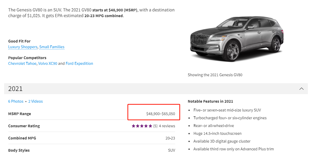 GV80在美国市场的起售价为48,900-65,050美元(约合人民币32.14-42.75万元),直接对标奥迪Q7(54950-60800美元,约合人民币36.11-39.96万元)、奔驰GLE、宝马X5等豪华车型。