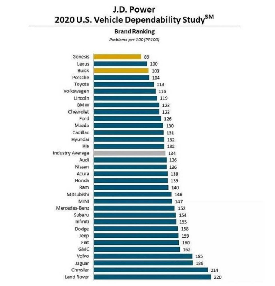 别看捷尼赛思只是个成立不久的新品牌,但出色的产品品质已经名扬四海。在J.D.Power 2020美国车辆可靠性排行榜中,捷尼赛思更是超越雷克萨斯、保时捷等,成为美国地区故障率最低的品牌。