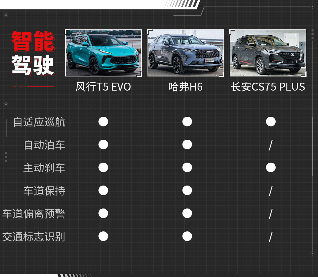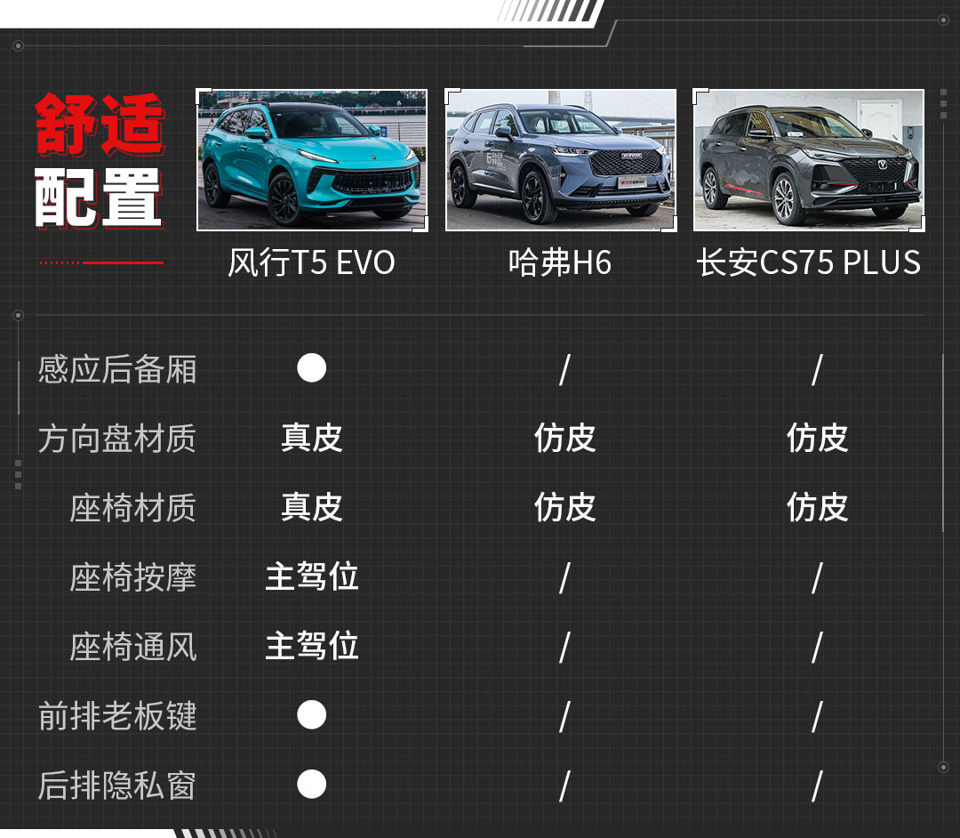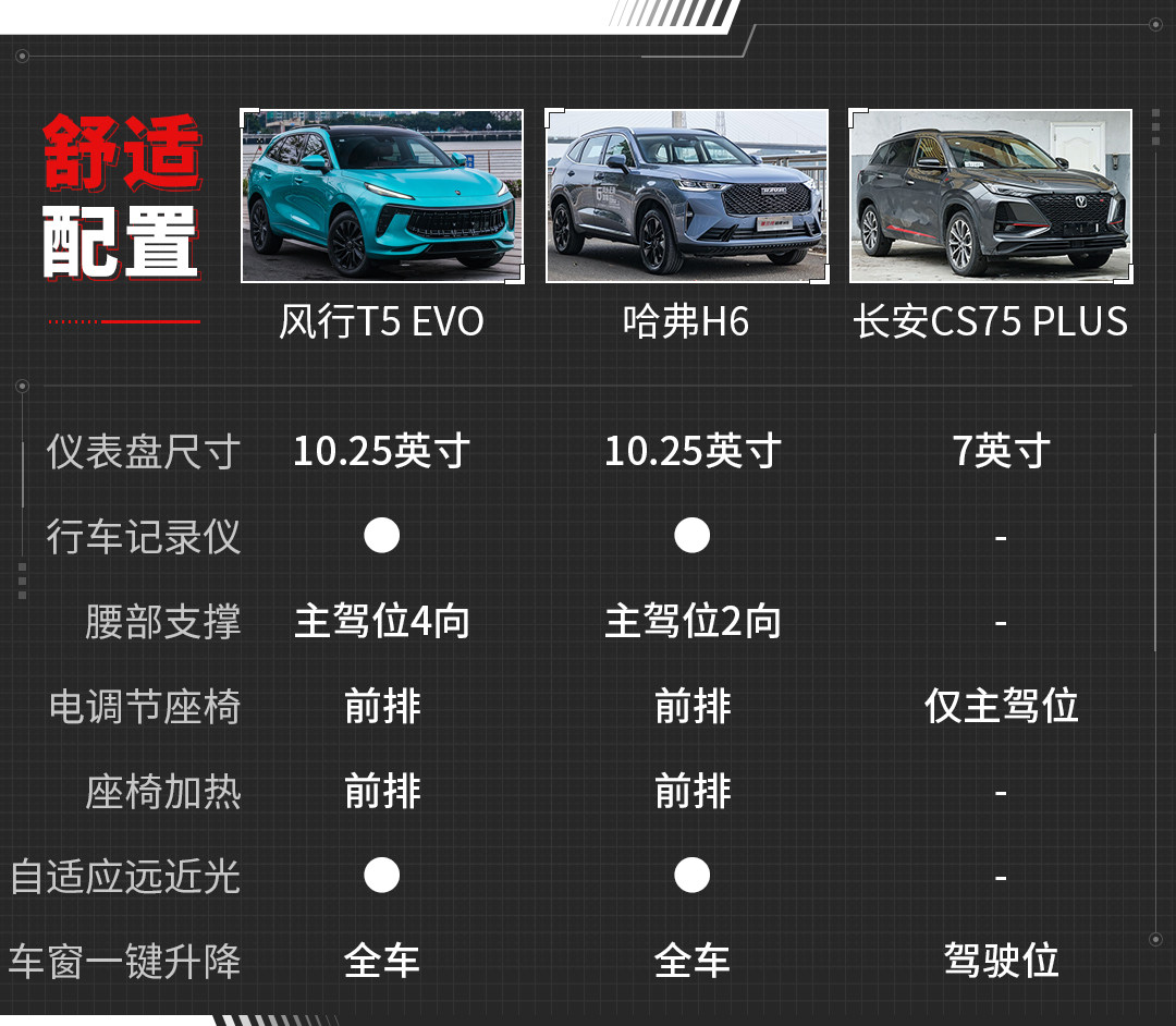 因为价格差异,风行T5 EVO做到了跟哈弗H6同样优秀,略优于CS75 PLUS;譬如都配备了内置行车记录仪、主驾座椅腰部支撑、前排座椅加热、自适应远近光灯和全车窗一键升降。