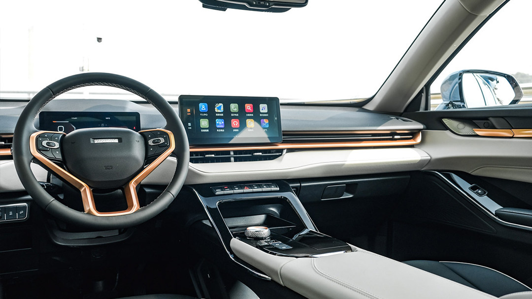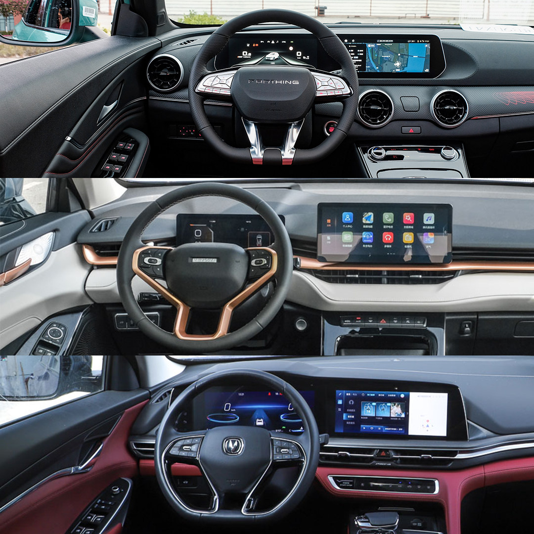 而来到车厢内部,虽然三款车的手法都不一样,但都有着两个大的共同点:科技、豪华。都是1.5T顶配的情况下,三款车都不约而同采用双大屏设计,全液晶的仪表盘+中控屏搭建出最符合当下需求的科技氛围。