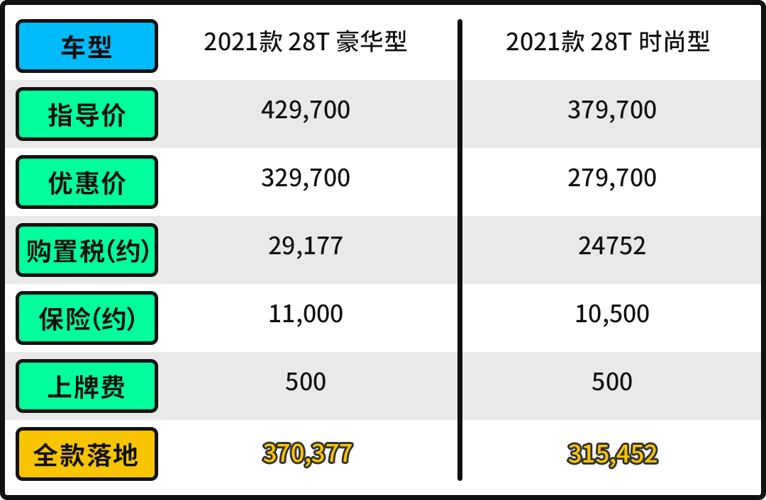 最终落地价方面,以推荐的车型为例,优惠完裸车价为32.97万元(以优惠10万元来算),购置税29177,商业保险+交强险1.1万元,上牌费500,全款落地在37万元左右;当然也可考虑分期购车,以首付30%分期三年来算,首付金额在13.97万元,月供6891元,仅供参考,大家请以当地优惠幅度为准。
