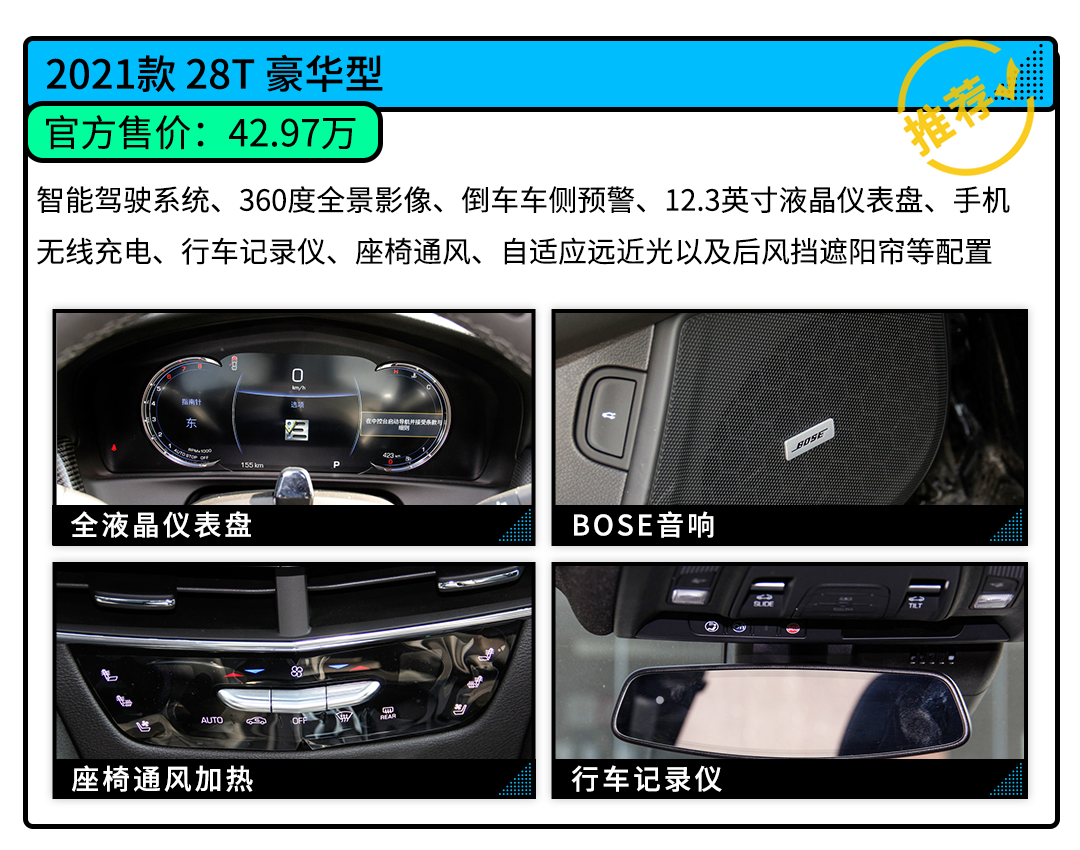 配置选择上,也是很多消费者比较在乎的,在买买君看来,凯迪拉克CT6豪华型是性价比较高的,相比入门版两款车型,多了智能驾驶系统(L2级别自动驾驶)、360度全景影像、倒车车侧预警、12.3英寸液晶仪表盘、手机无线充电、行车记录仪、座椅通风、自适应远近光以及后风挡遮阳帘等配置;当然如果预算不足,那还是考虑入门版两款车型,配置一样很丰富。