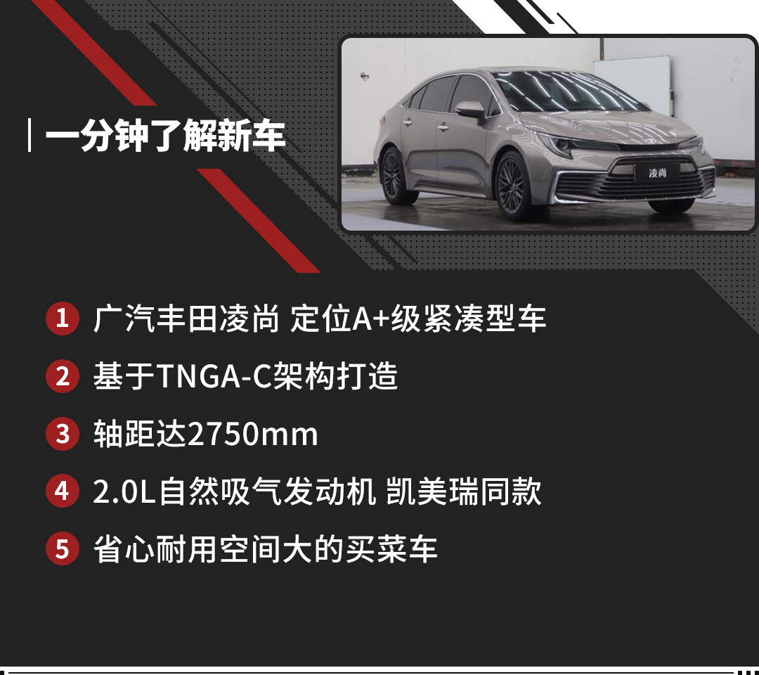 凌尚是广汽丰田基于TNGA-C架构打造的全新A+级轿车,将与一汽丰田的兄弟车型亚洲狮一同填补紧凑型车和中型车之间的细分市场。外观上看,前脸几乎与雷凌没有太大的差别,只是前格栅的设计用上了更多的横条辐,并且延伸至前大灯下方的边框区域,相比雷凌而已前脸少了些许运动感,多了分从容。