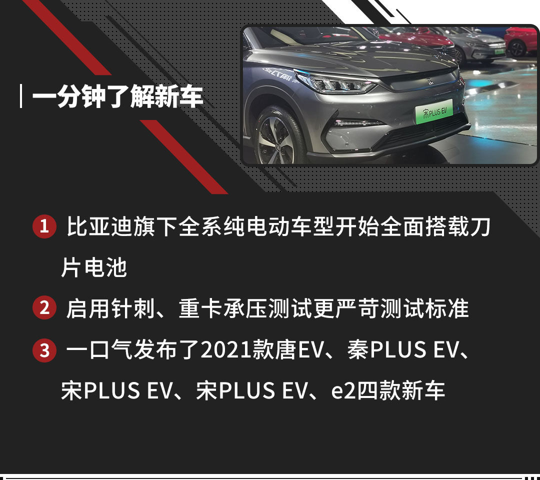 紧接着,4月7日,比亚迪连发四款新车,旗下全系纯电动车型开始全面搭载刀片电池,并且启用针刺测试更严苛测试标准。具体来看,2021款唐EV综合补贴后售价为27.95万元-31.48万元,共推出3款配置车型;2021款 秦PLUS EV综合补贴后售价为12.98万-16.68万元,共推出4款配置车型;2021款宋PLUS EV综合补贴后售价 16.98万-18.68万元,共推出两款配置车型;2021款e2综合补贴后售价为9.98万-11.58万元,共三款配置车型。