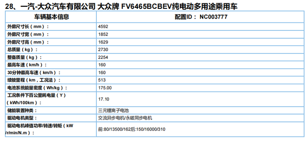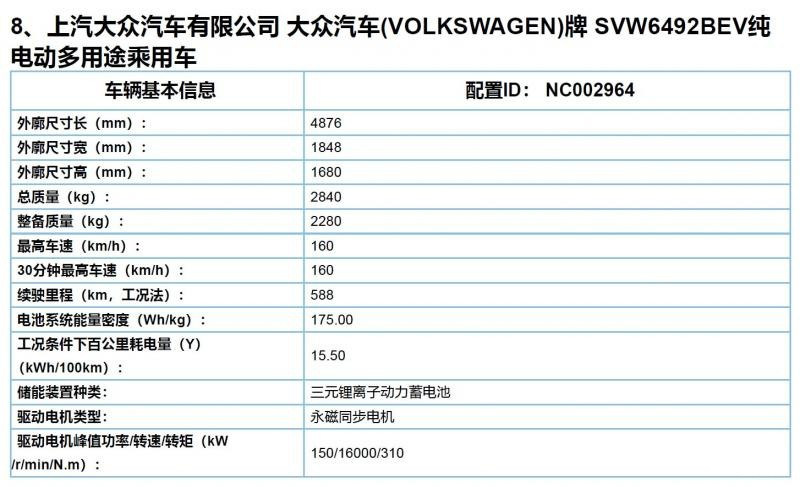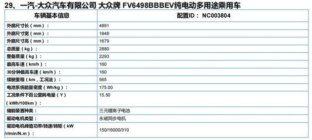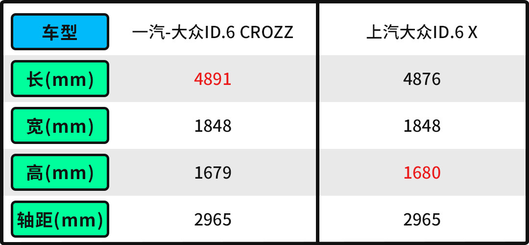 另外根据工信部的信息,一汽-大众 ID.6 CROZZ的尺寸为4891/1848/1679mm,整备质量为2293kg,而上汽大众ID.6 X的尺寸为4876/1848/1680mm,整备质量为2254kg,两者的尺寸都差不多,轴距均为2965mm。