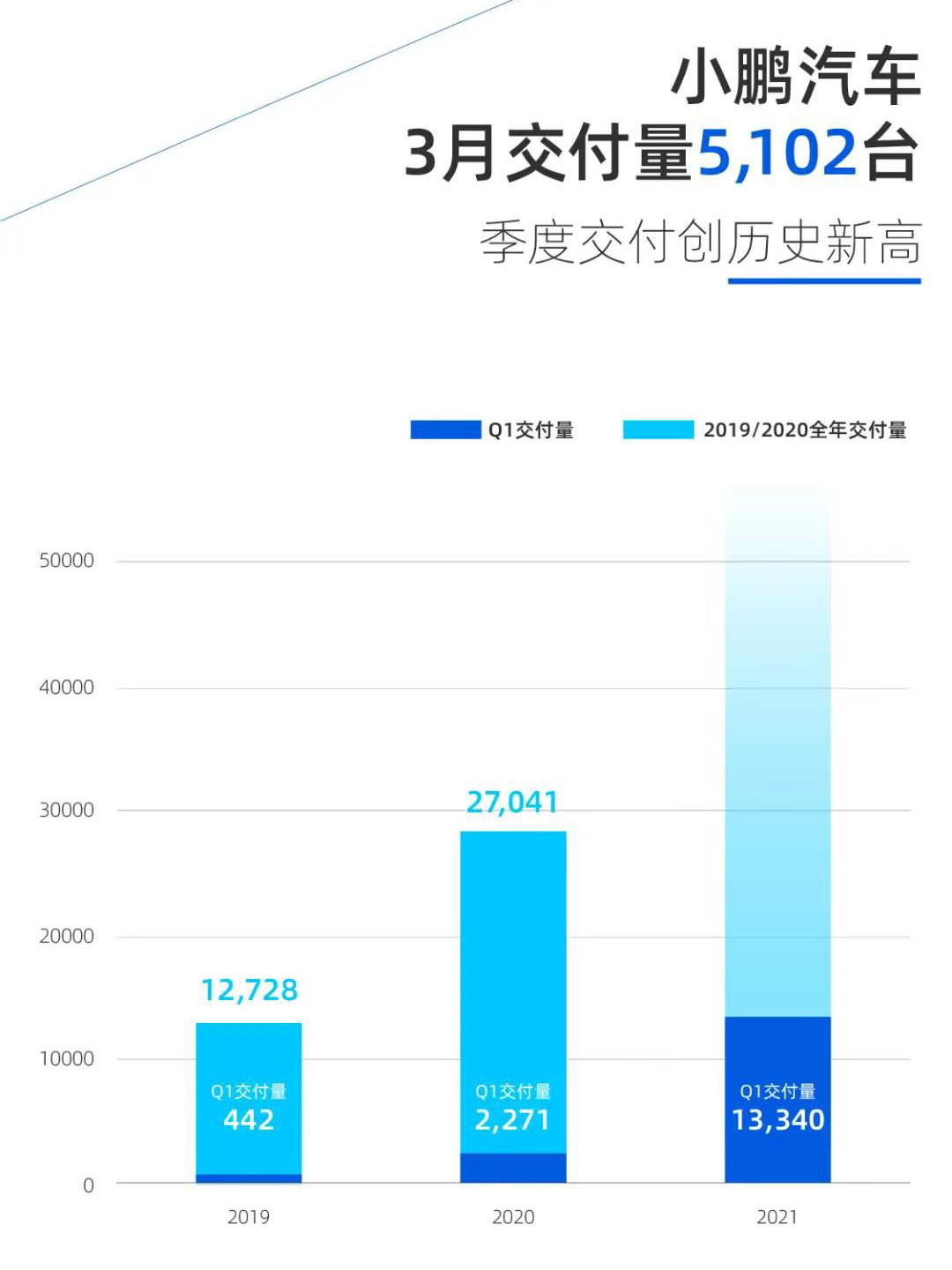 从季度销量来看,小鹏汽车第一季度总交付量达13340台,超越了2020年四季度的12964台,成为小鹏汽车历史最高的季度交付成绩,一季度对比去年同期更是大增487%。