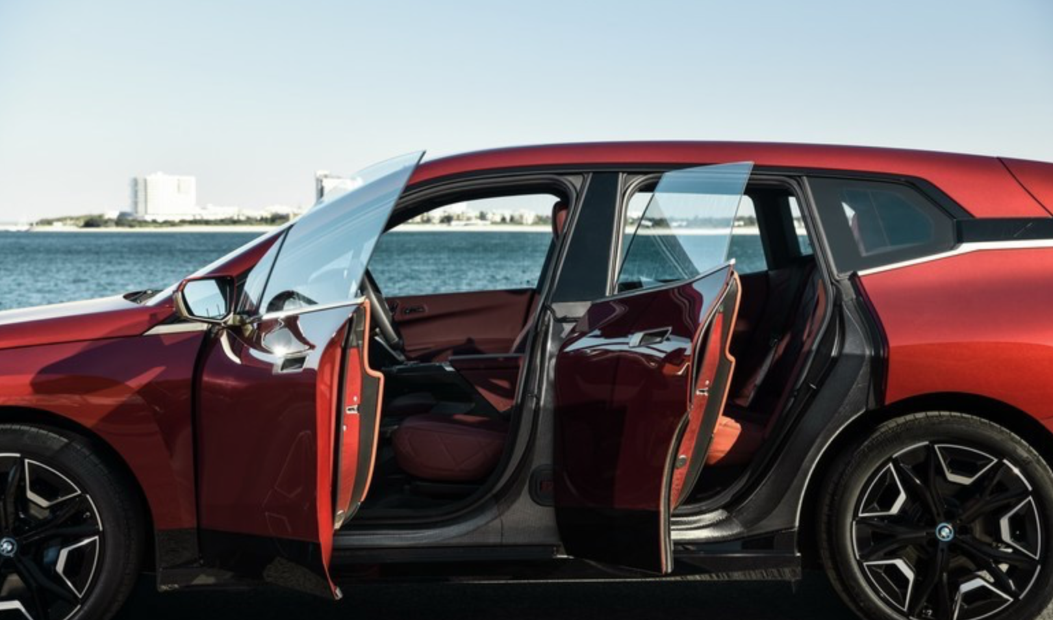 其次,宝马iX还用上了拉风的无边门框,要知道,这可是宝马史上首次将无边门框用在了中大型SUV上。而为了突显运动的属性,新车还采用了溜背式造型设计,配合空气动力学轮毂,整车的风阻系数低至0.25cd,可媲美很多跑车。