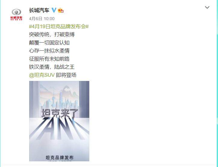 近日,长城汽车官方的一则微博引起了很多消费者的关注,那就是长城汽车将在4月19号的上海车展上,正式将坦克品牌独立出来,成为哈弗、WEY之后的第三个独立的品牌。
