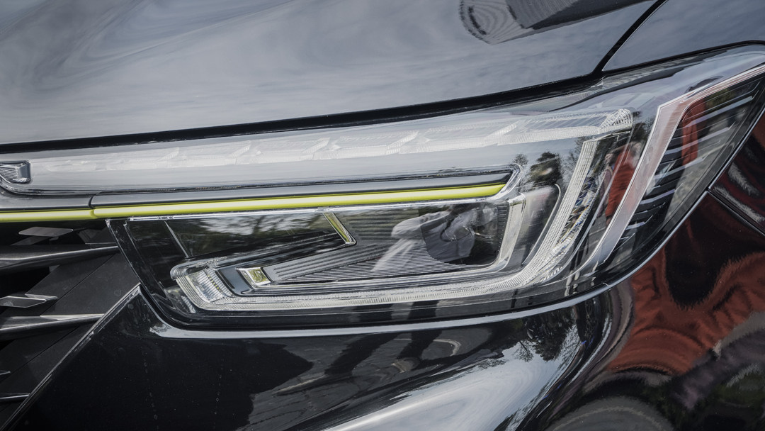 头灯造型依旧延续现款车型,环绕式的日间行车灯配合上中网上方的绿色装饰条整体感较强,并且能提升视觉宽度;车标置于格栅顶部中心,提升整体的视觉冲击力,也突出荣威新的战略方向。