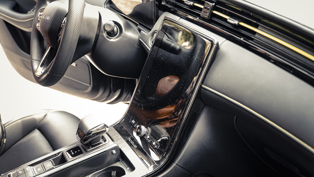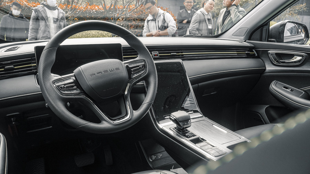 方向盘造型延续荣威家族化设计,但色彩纹理转变为钨钢电镀样式,钨钢电镀和打孔皮革搭配,呈现出冷峻、睿智、非凡的视觉感受。