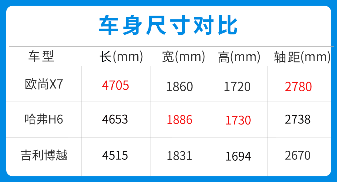 车身侧面,修长笔直的腰线贯穿整个车身,拉伸了车身的视觉长度,配搭19英寸的大轮毂,显得非常魁梧霸气。在车身尺寸方面,是欧尚X7相较同价位车型最大的优势了,长宽高分别为4705*1860*1720mm,轴距达到了2780mm,与中型SUV标杆的汉兰达相近(2790mm),很好的满足消费者对于空间上的追求。