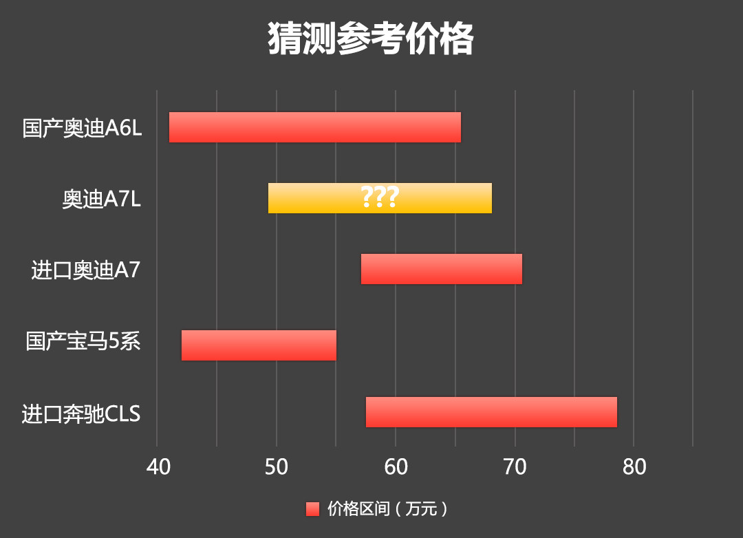 关于A7L的价格猜测,我们可以选几个车型作为价格参考锚定:国产奥迪A6L、进口奥迪A7、宝马5系、进口奔驰CLS。