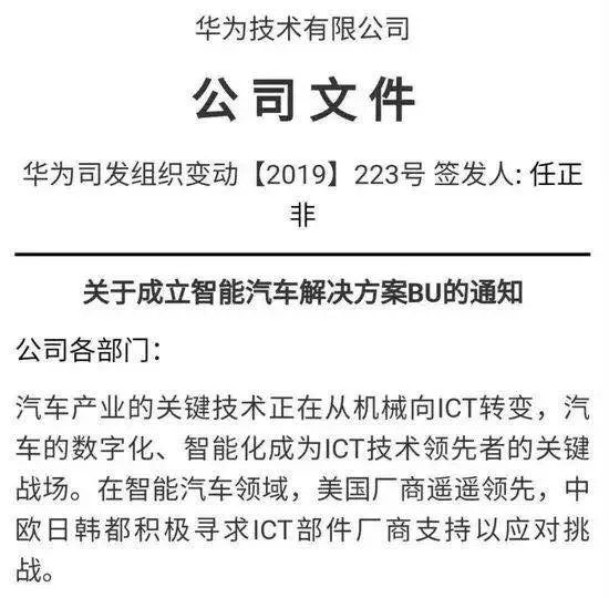 虽然华为董事长任正非先生明确表示“我们是有边界的,华为永远不会造车”,但是华为会在自己最擅长的方面赋能车企,所以我们可以看到智能汽车解决方案BU(业务单元)部门的设立。