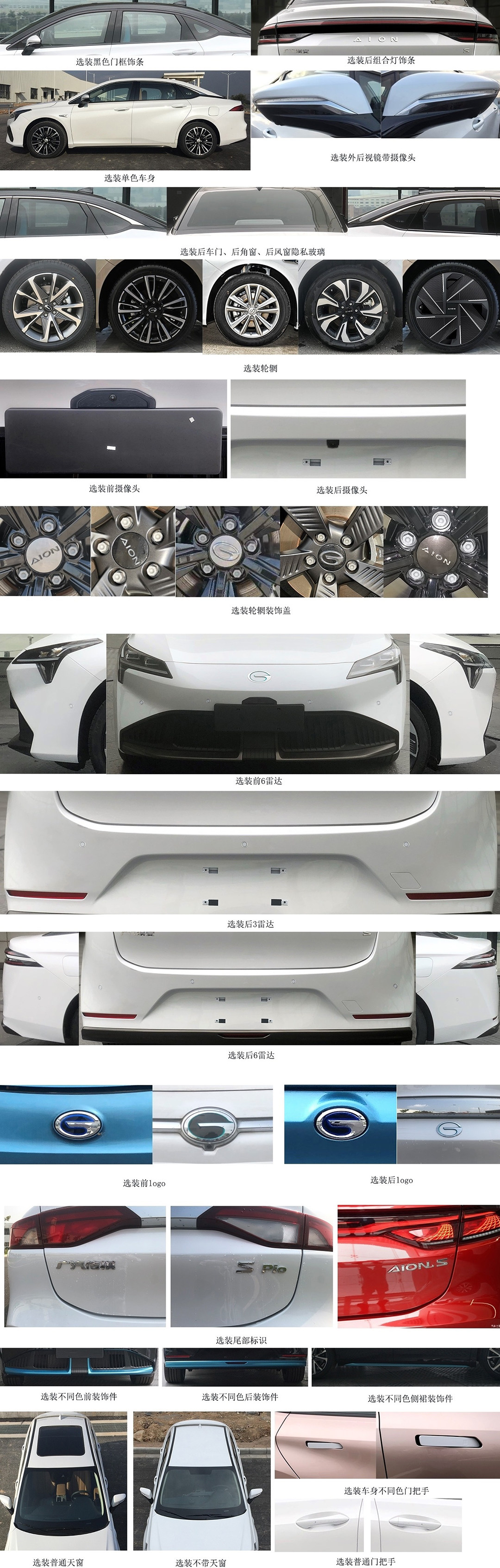 配置方面,改款AION S对于配置的不同,提供黑色门框饰条、后组合灯饰条、单色车身、带摄像头的外后视镜、位于后车门、后角窗和后挡风的隐私玻璃、5种样式的轮毂,前摄像头、后摄像头、前6雷达、后3雷达、后6雷达、不同色的前后装饰件、不同色侧裙装饰件,以及天窗和门把手等,可选ETC车载装置。
