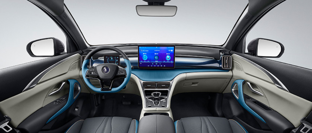 内饰方面,可以说是宋Pro的精髓,整体的布局设计很有新鲜感,会让人眼前一亮,采用了比亚迪官方称之为“龙须”的设计,小尺寸的悬浮式仪表和12.8英寸的可旋转悬浮式中控屏,既简洁而又富有科技感,加上车内选用了釉玉蓝+苍穹灰的双色设计,营造出清新典雅的氛围,豪华感很强。