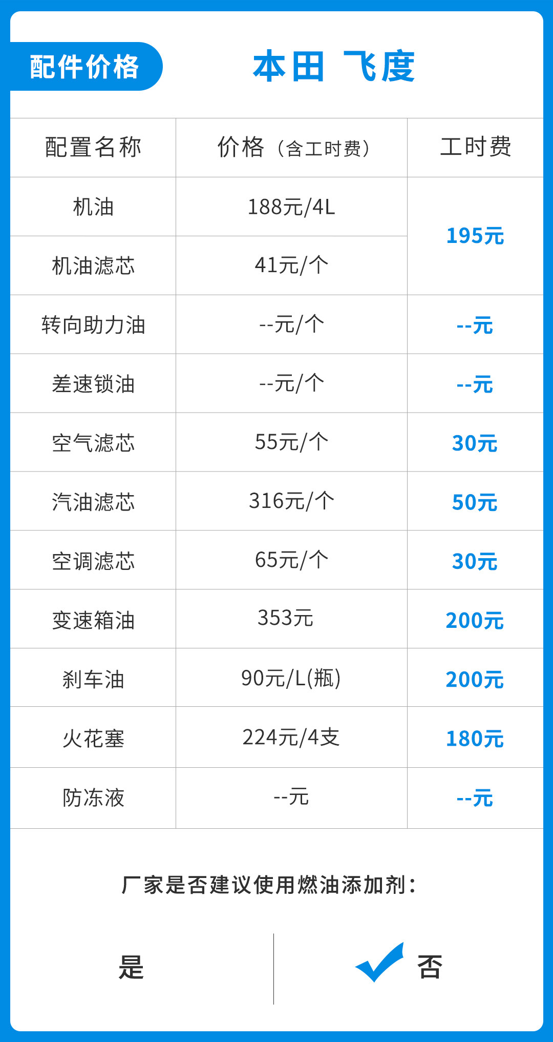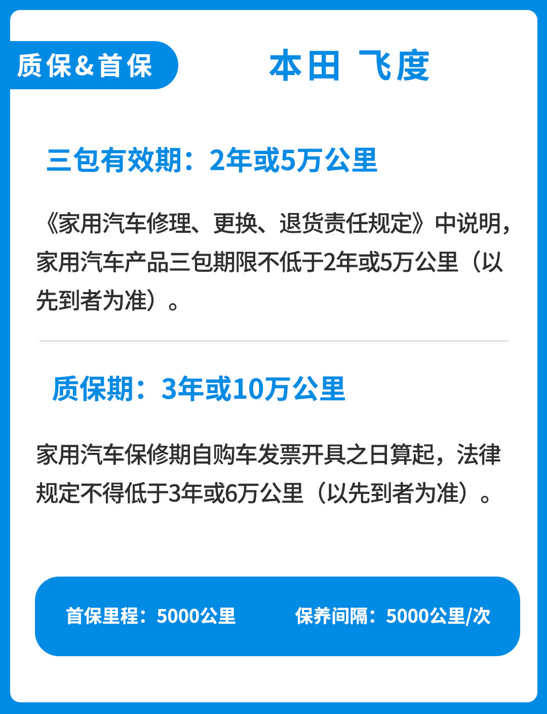 飞度的首保在5000公里,并且保养周期也为5000公里一保。虽然相较很多10000公里一保的车辆要花费更多人工成本,但考虑到保养成本不高,也算是比较能接受。
