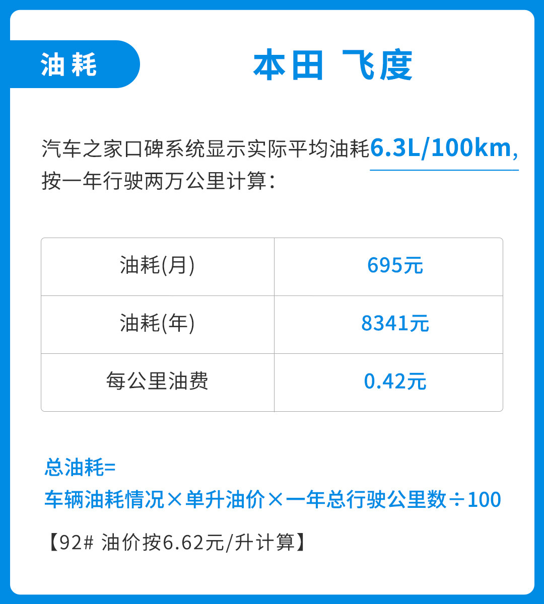 而在油耗方面,号称节油大师的飞度百公里油耗仅6.3L,虽然无法媲美一些油电混动类产品,但在同级别的燃油车中已经算是非常低的水准,对于收入不高的年轻消费者也非常友好。按照广东目前6.62元/L的油价计算,一年跑20000公里的油费开销为8341元,平均到每个月燃油花销不足700元。