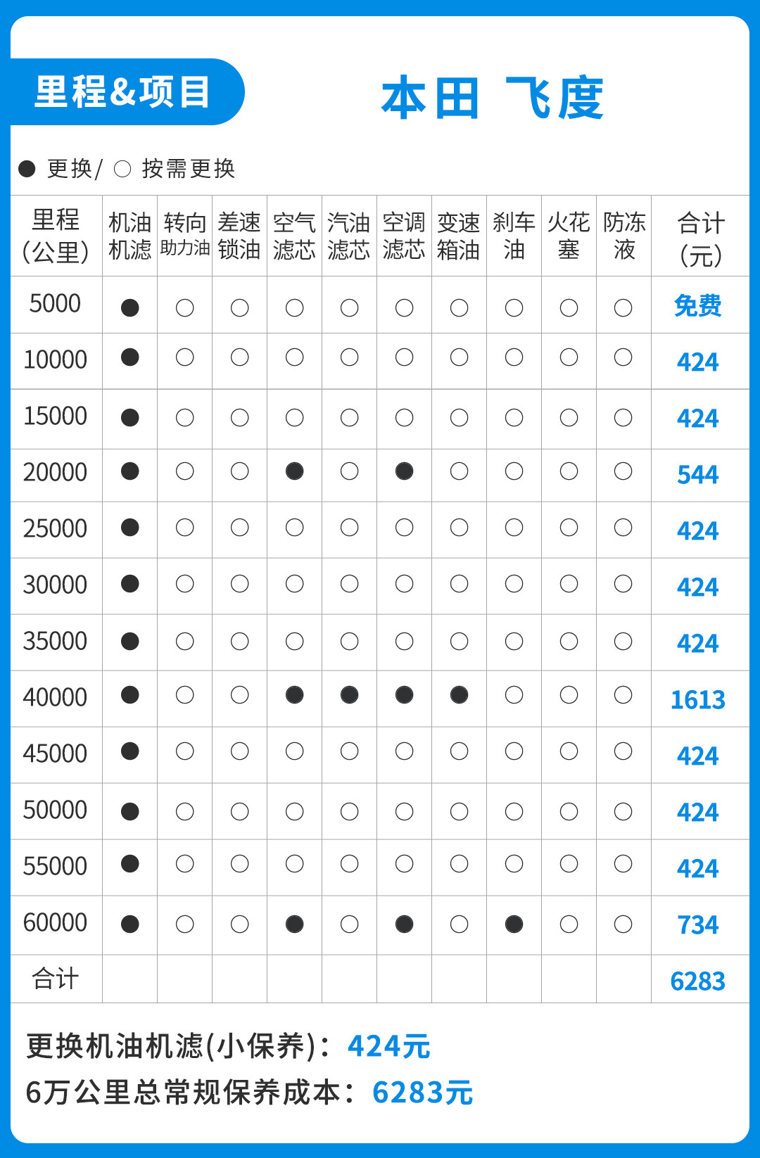 飞度较大的一次保养出现在40000公里,由于20000公里一换的空气滤芯和空调滤芯与40000公里一换的汽油滤芯和变速箱油都达到更换周期,因此会产生1613元的养车支出。而3年60000公里下来,一共会产生6283元保养支出,平均每年就是2094元。