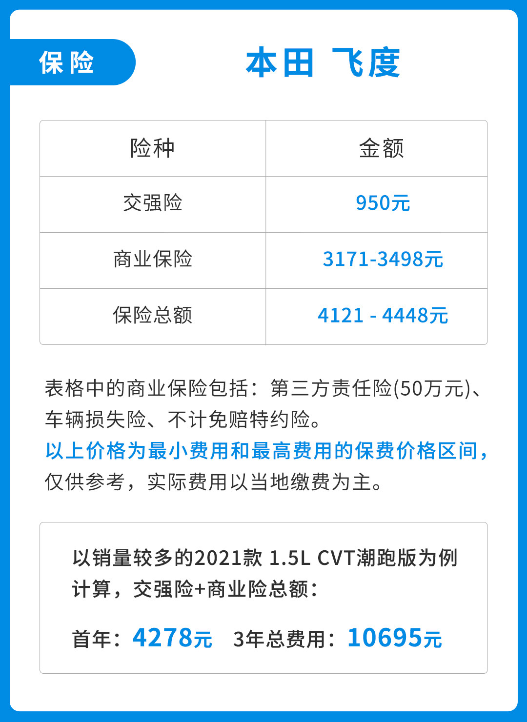 在保养方面,以现款飞度主销CVT潮跑版的为例,车型首年的保养费用为4278元。而如果后续未出险,保险费用会逐年下降;在3年无出险情况下,飞度的保险费用为10695元。