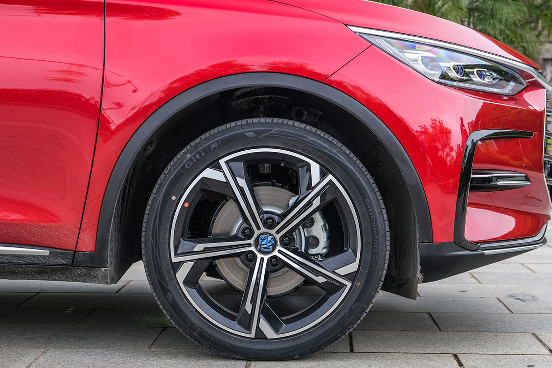 外观上与唐DM最大的不同点就在于轮胎,而唐DM的是22英寸轮圈+Brembo刹车,非常高规格的硬件,唐 DM-i配备规格为 245/45 R20的轮胎,轮圈采用五辐式双色造型,配备的是佳通的静音舒适胎,作为一辆家用车,已经完全足够。