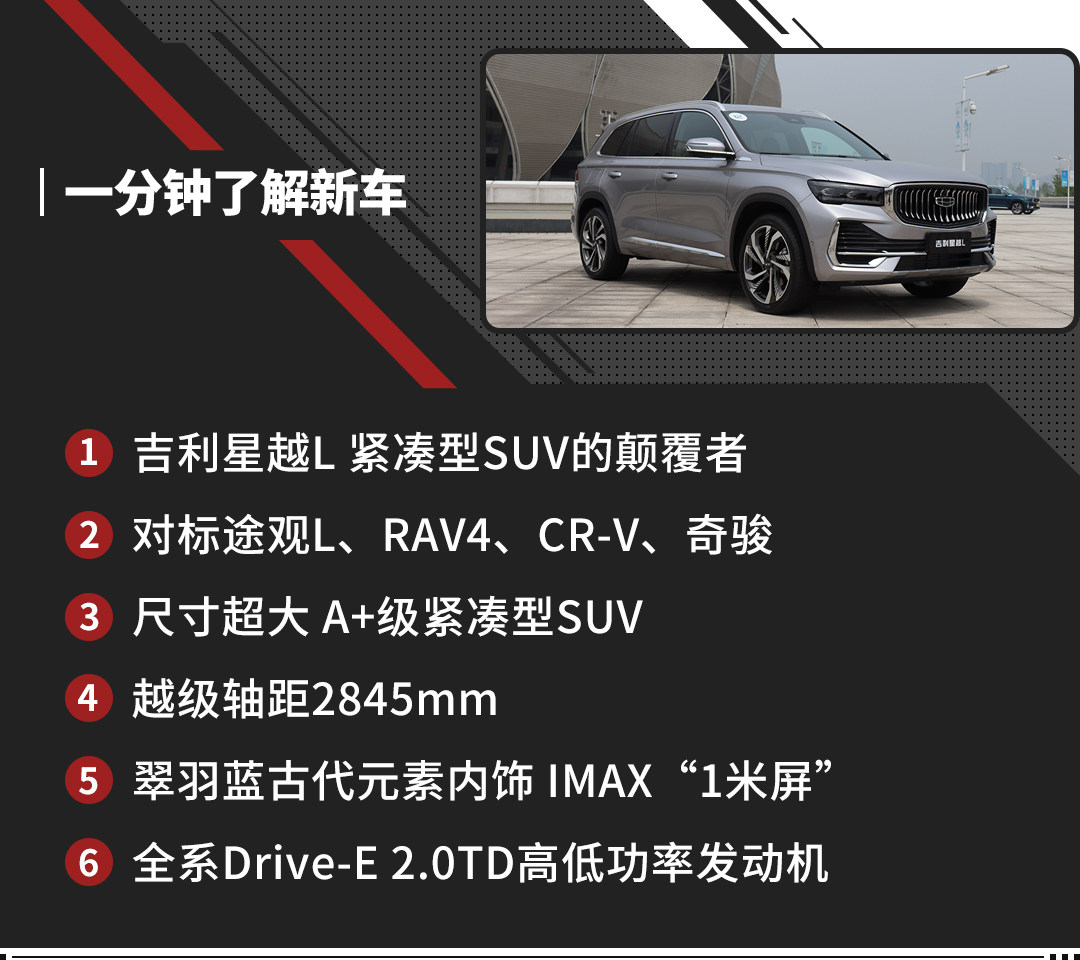 官方称吉利星越L集吉利汽车三十年来所有的造车经验打造,运用了目前吉利汽车最先进、最安全的技术!并将它的对手锁定在途观L、CR-V、RAV4、奇骏等主流紧凑型SUV,下面就一起来看看星越L到底有没有这样的实力吧!