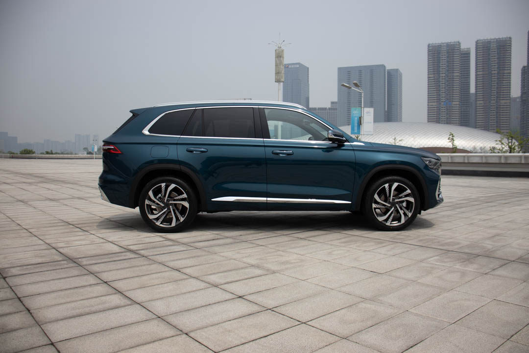 车身侧面,星越L整体设计非常简洁,一条粗壮的腰线从车头贯彻至车尾,官方称之为“星际穿越腰线”,车窗边缘和车门下部使用镀铬饰条进行装饰,增加精致感。