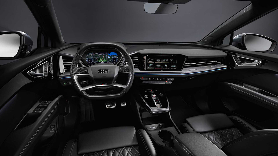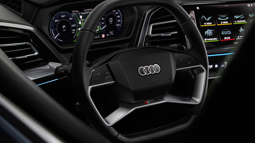 内饰方面,其实Q4 e-tron的内饰已经在上个月有过亮相,车内的设计与现款有着明显区别,采用了全新的设计理念,整体布局偏向于驾驶员一侧形成环抱式驾驶舱,新车中控台中央扶手箱一同造就独特的悬崖式设计,再加上奥迪的看家本领10.25英寸虚拟驾驶舱仪表盘和11.6英寸的中控大屏组合,一同为驾驶员展示几乎所有的行车信息;全新造型方向盘和按键式电子换挡机构,让新车在内饰上充满浓厚的科技感。