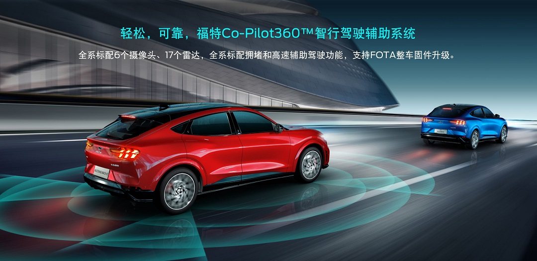 科技配置方面,福特Mustang Mach-E也是很厉害的,全系标配6摄像头、5毫米波和12超声波雷达组合的Co-Pilot360智行驾驶辅助专业包,带有全速域ACC巡航、车道居中辅助,还可选配更高级的升级包。