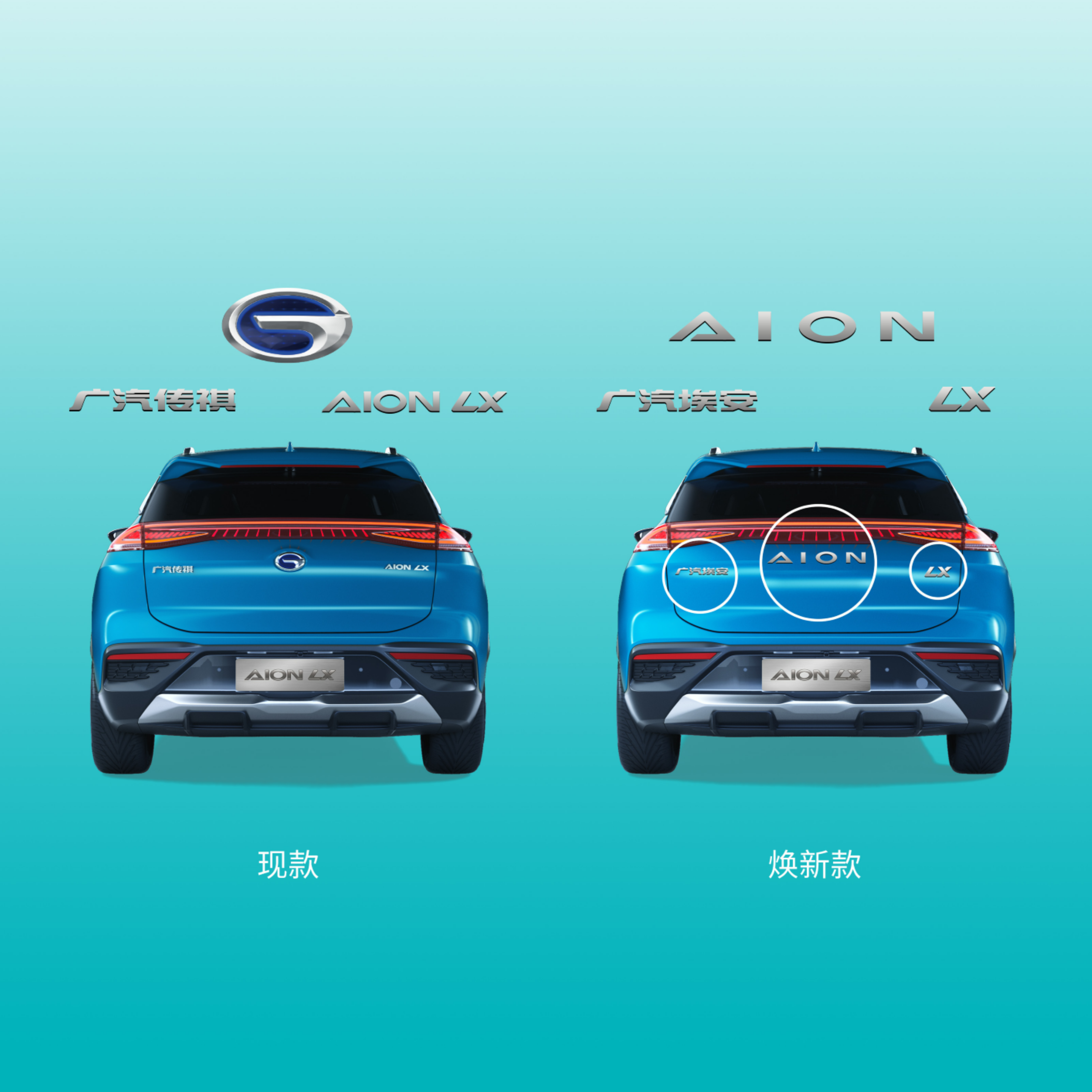 焕新后的AION 车型标识,最大的变化在于品牌名称由“广汽传祺”变成了“广汽埃安”,以此宣示埃安的品牌独立。