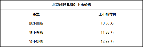 30而Li,不将就!4月16日,北京越野全新承载式SUV ——BJ30正式上市,上市指导价10.58-12.58万。新车延续了大众对其“小战狼”的称谓,别开生面的以专属动画IP形象“三只小狼”的名字“狼小美版、狼小奔版、狼小野版”命名三个版型,并以其独具特色的产品亮点,敲开了竞争激烈的紧凑级SUV市场的大门。
