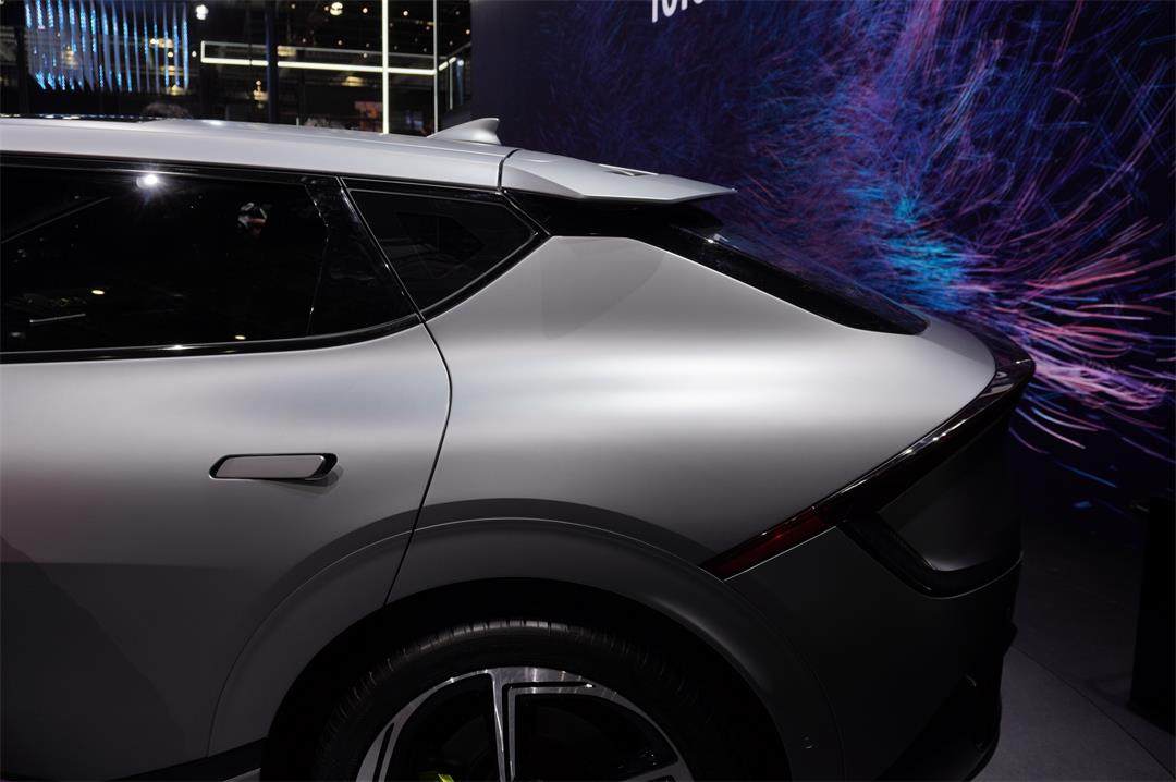 而在车尾方面我认为是起亚EV6设计最大的看点,首先溜背的设计带来的是明显的跨界造型,掀背尾门在开启时也是一道亮丽的风景线,同时独特的尾灯造型以及贯穿式尾灯元素的加入,车尾的灯组造型点亮后辨识度完全不输前大灯。并且值得一提的是,为配合新车,KIA的Logo也换成了全新的设计。