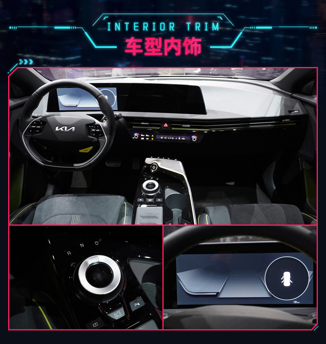 双幅式方向盘造型、中控与仪表盘的联屏设计、旋钮换挡等都尽量避免了车内复杂造型和线条的使用,并且在功能相对繁琐的空调面板上,EV6也竟可能采用了极简的设计。并且一键启动按钮设置在了黑白两色面板的交界处,也显得尤为显眼。