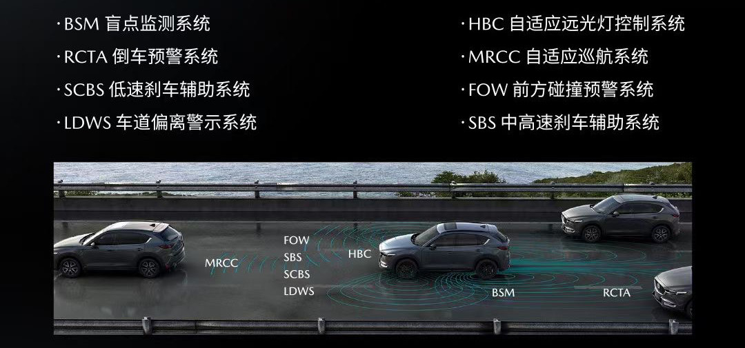 另外一个改变的方面是驾驶辅助配置,CX-5黑骑士版配备了主动刹车、车道偏离预警、自适应巡航和倒车车侧预警,除了顶配以外,非黑骑士版本车型都需要选装。