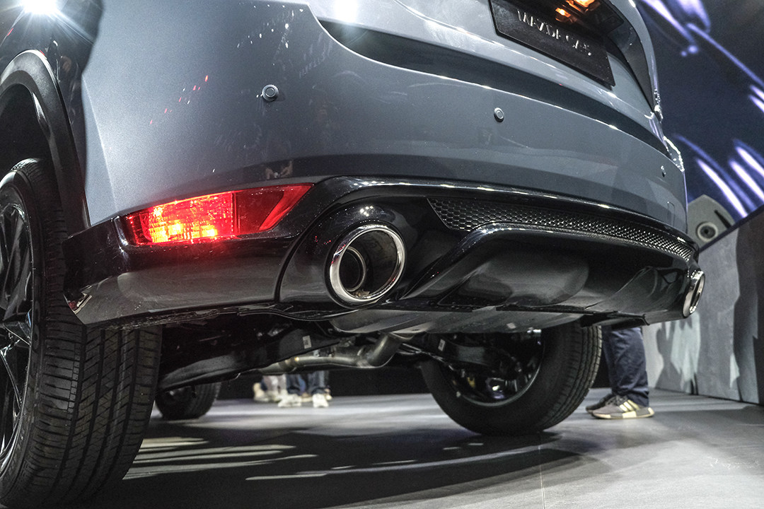配备19英寸轮胎,轮圈造型采用黑化的多辐式造型;后包围比较有气势,排气孔口径比普通版车型更大,而且与后包围连为一体,非常有气势。