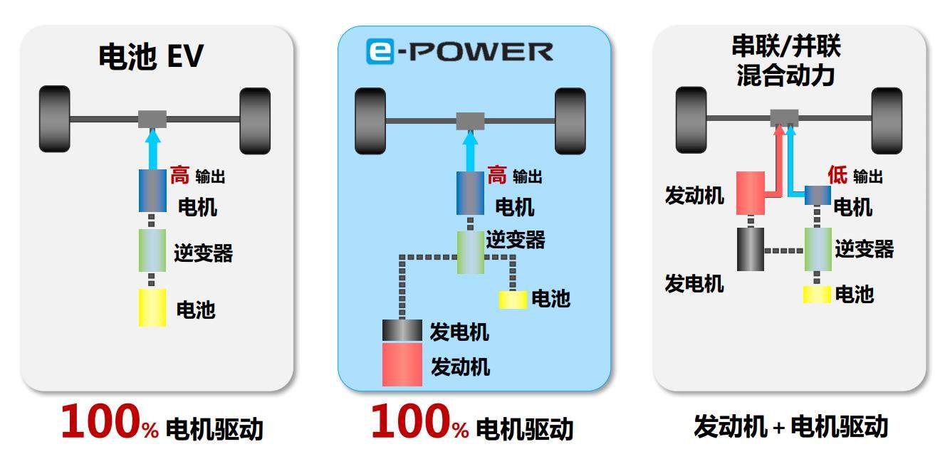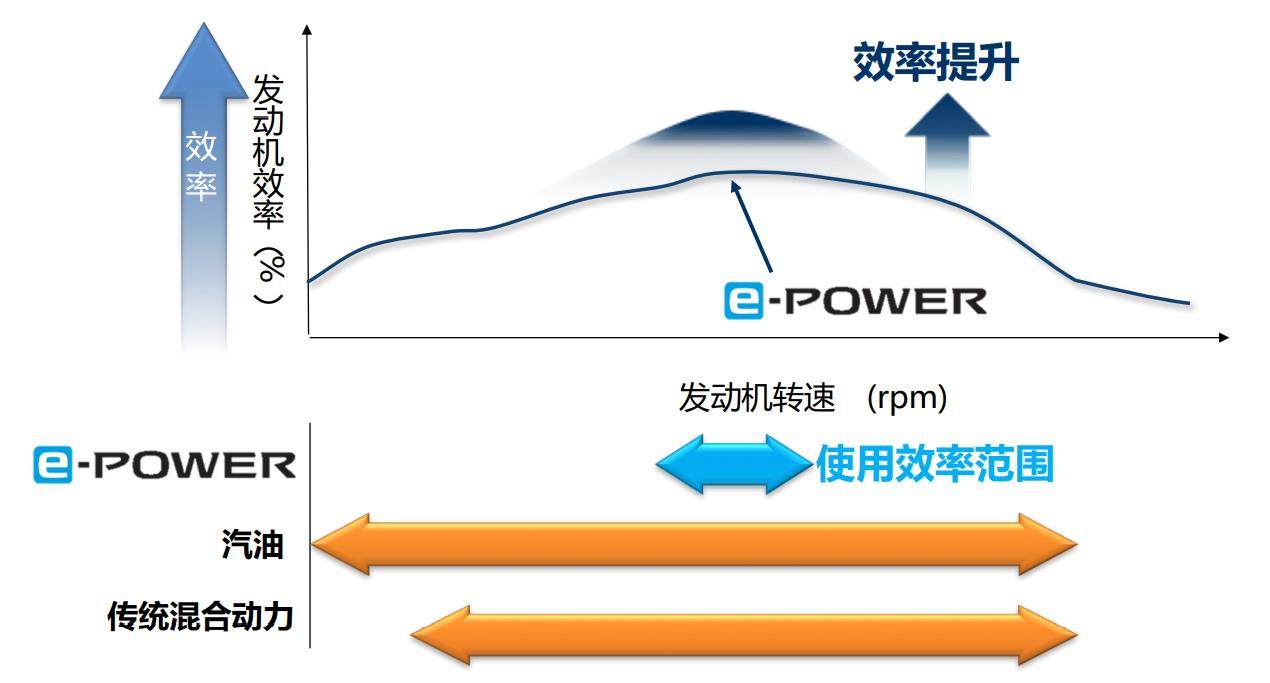 e-POWER系统跟其他的增程式混合动力不同的是,这套动力是完全纯电驱动,内燃机不会直接参与驱动,内燃机永远以最高效率工作,所以能够做到2.67L/百公里油耗这么低的油耗。