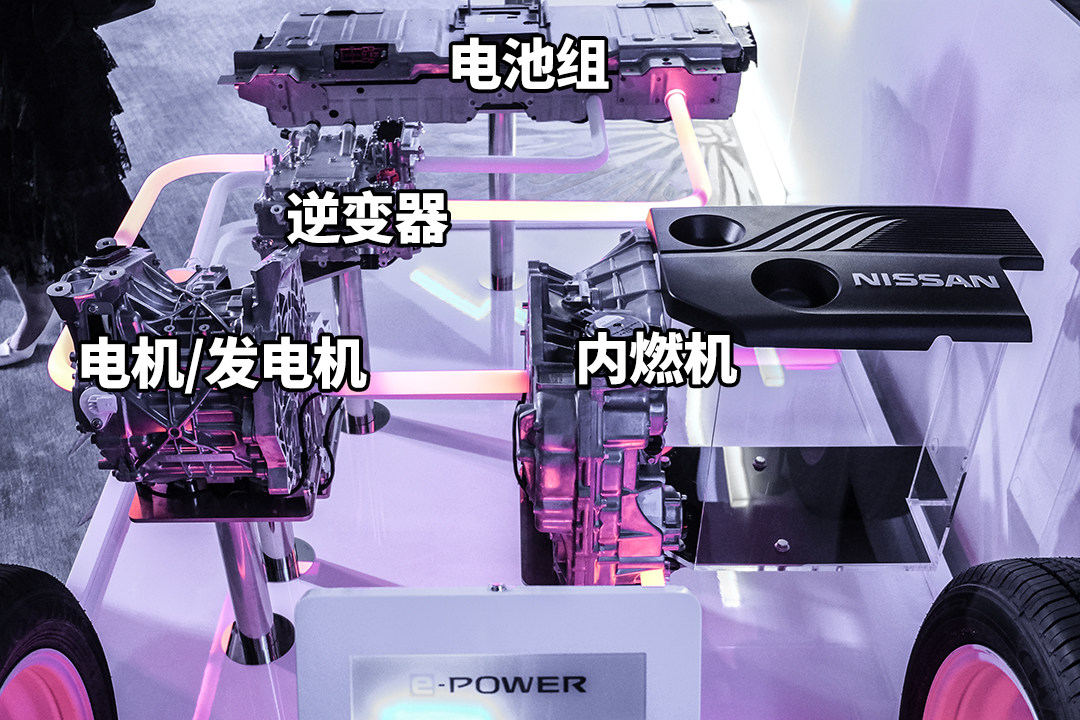 工作逻辑上发动机不参与动力输出,发动机通过燃料做功,转化为电能给电池组充电,经逆变器抵达驱动电机,再由驱动电机输出动力传递到车轮。