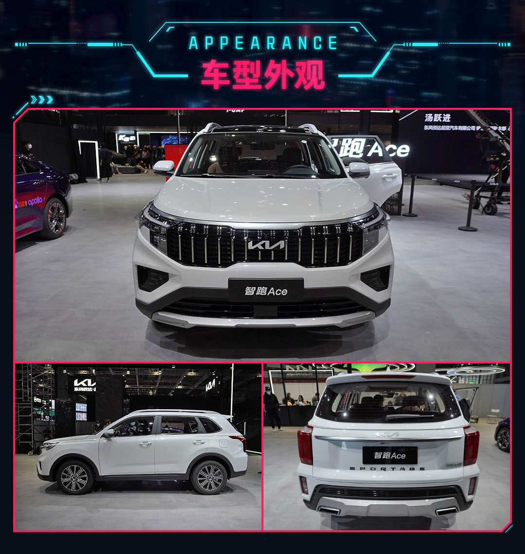 作为起亚智跑的中期改款车型,智跑Ace延续了现款智跑硬朗的风格,整体的造型和先前公布的原型车基本保持一致,车身线条干净利落,车头方正大气,厚重感十足。