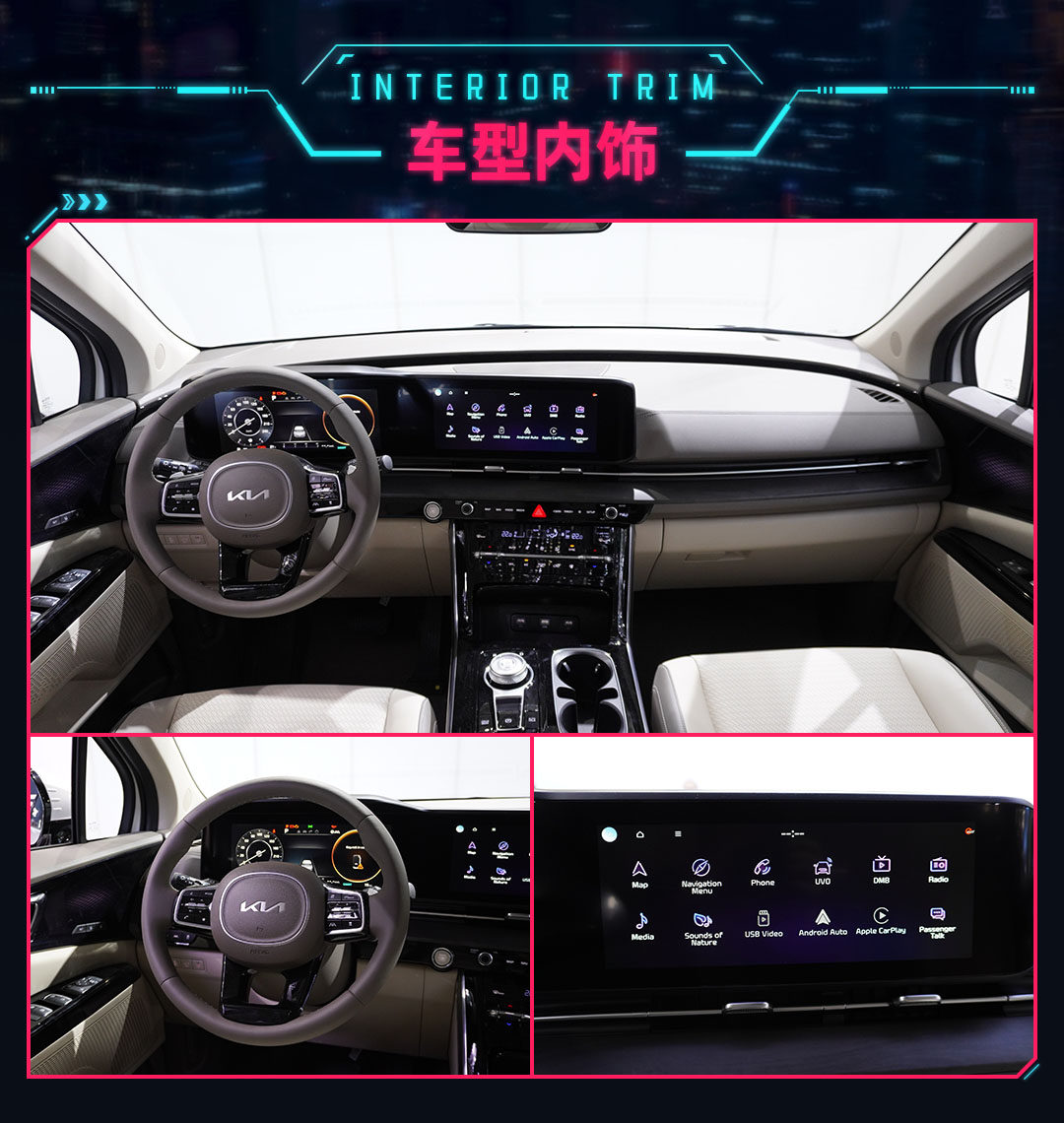 内饰沿用了海外版的风格,整体的设计比较简洁,采用了时下流行的贯穿式空调出风口设计。而内饰最大的亮点当属中控屏和液晶仪表盘组成的双连屏了,这样的配置在新款K5上也有运用,整体看上去科技感十足。