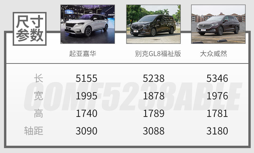 新车的长宽高分别为5155/1995/1740mm,轴距为3090mm。与同级的GL8和威然相比,嘉华在车身宽度方面有着一定优势。