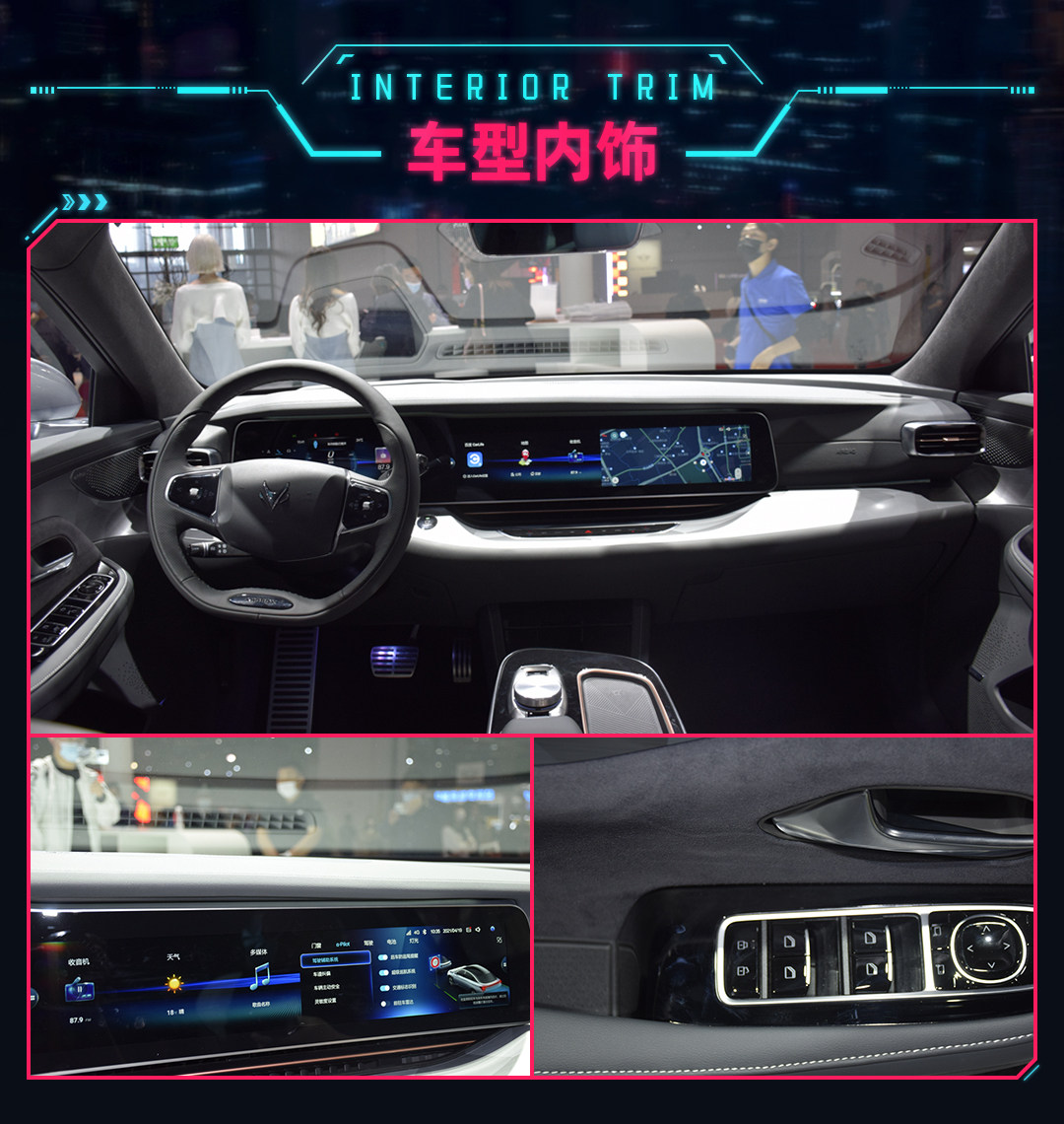 内饰部分,阿尔法S采用了贯穿式中控台设计,内饰配色采用的是双色搭配,内饰整体较为简洁,其最大的亮点无疑是超大尺寸中控屏。