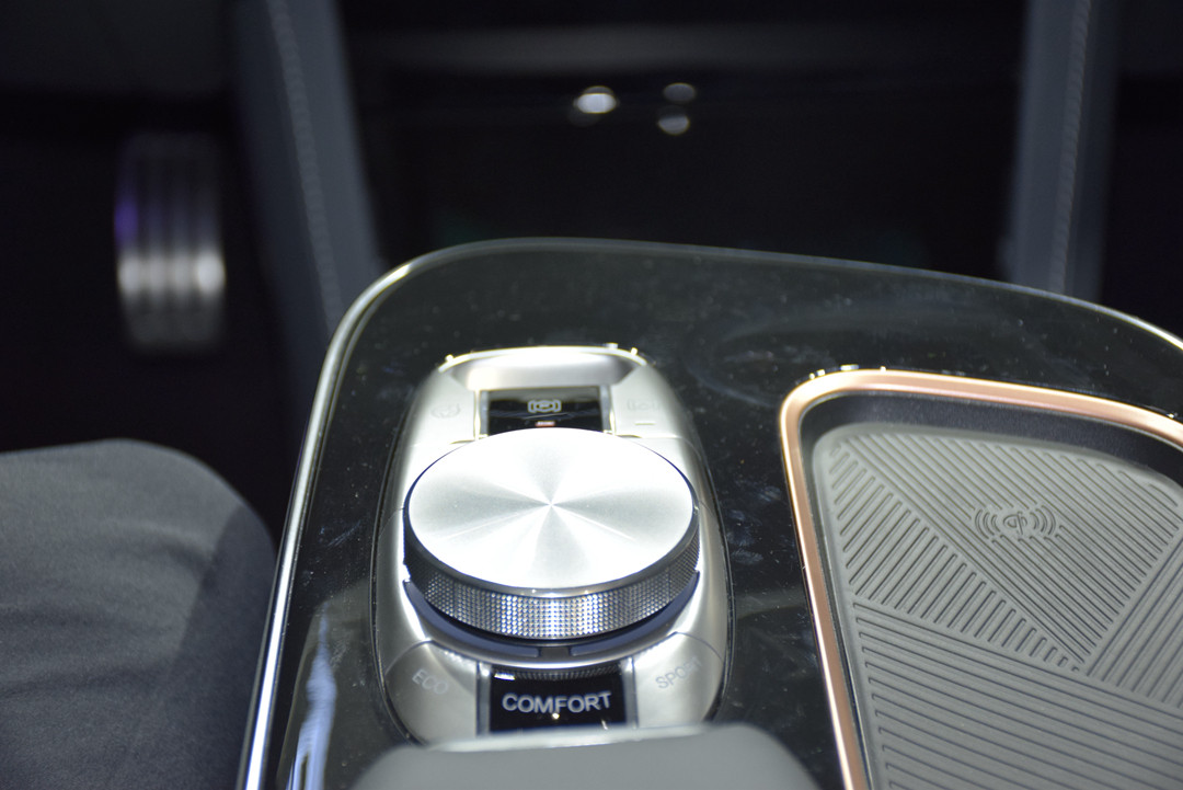 不过,这块超大屏也并未囊括所有功能,在大屏下方区域,还设置了一块空调控制面板。并且在前排中央扶手处还集合了驾驶模式控制,旋钮+按键的结构在操作逻辑上与传统燃油车接近。