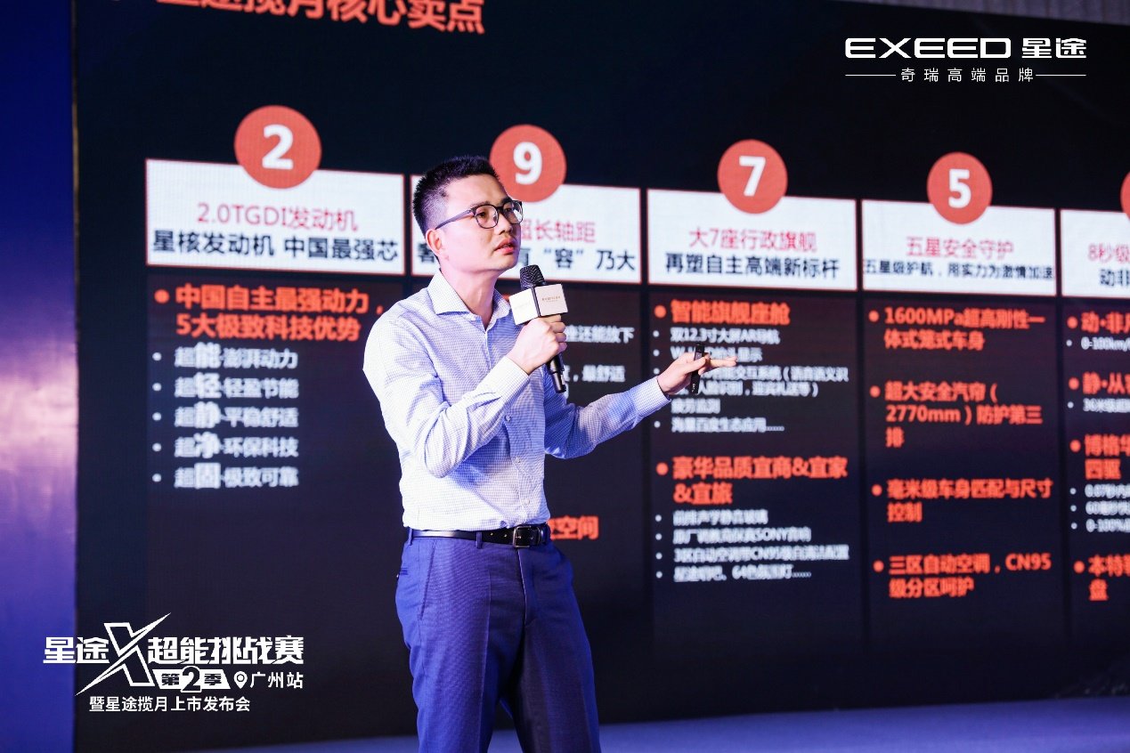 星途X-超能挑战第2季暨星途揽月上市发布会广州站,上市的礼宾级大7座SUV星途揽月,既代表了EXEED星途在自主高端品牌中“旗舰级”的硬核实力,以及领航时代前沿的智能科技,又展现出新时代年轻态消费者对“新国潮”的追捧和热爱。